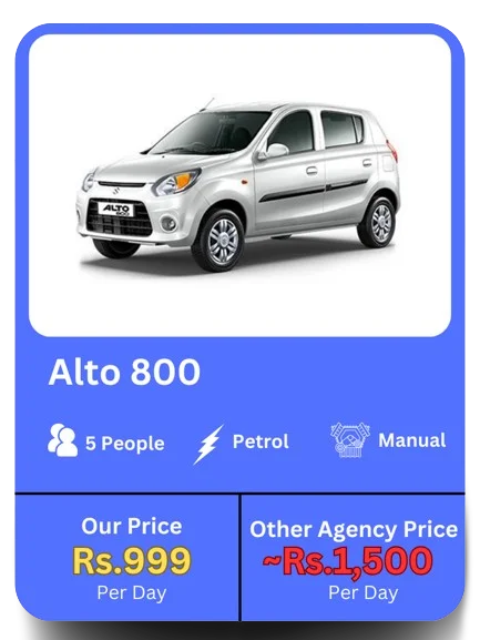 We provide Alto 800 and Alto K10 self-driving cars on rent and also cars with drivers at the lowest price in Guwahati starting at just Rs.999. We don’t just say lowest price, we give guarantee. And we pay penalty if you can find cars anywhere else at lower price than ours.